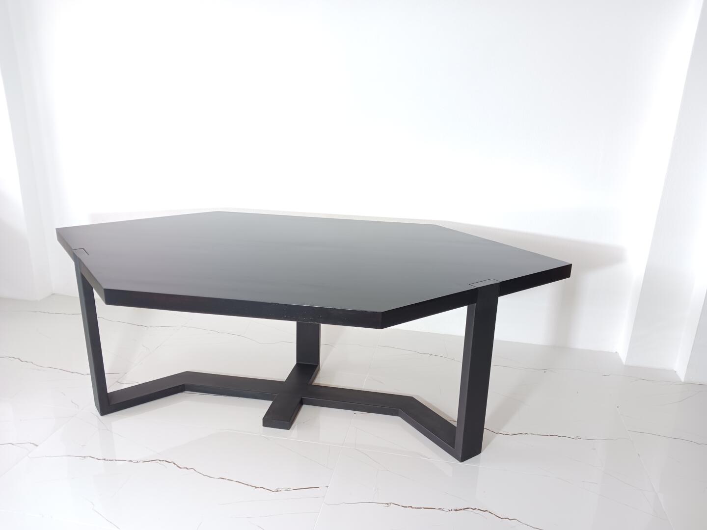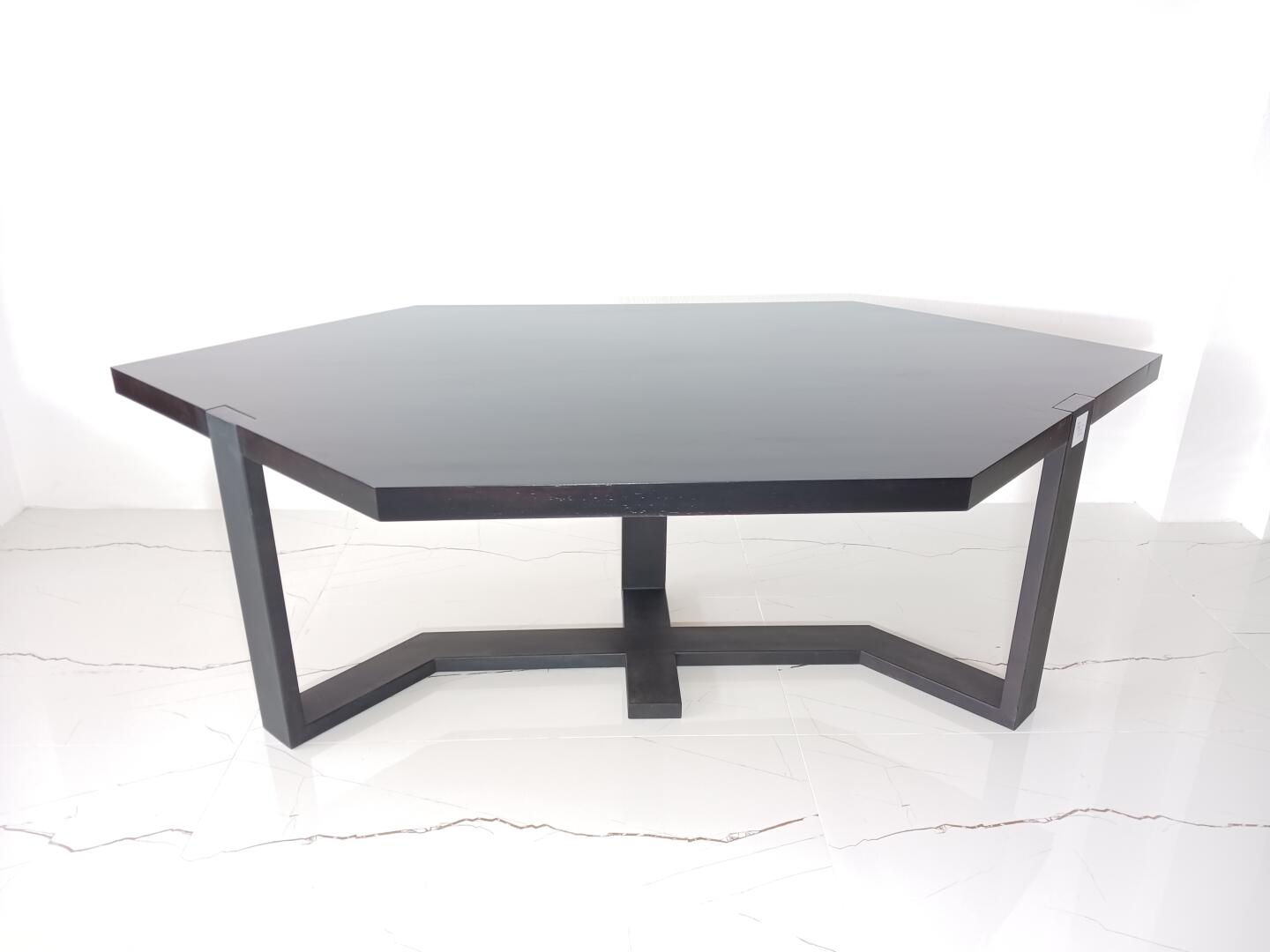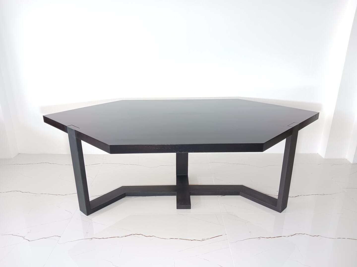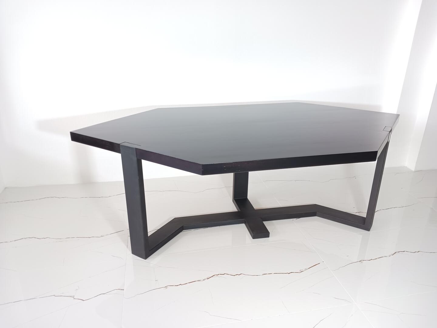 Mesa de Jantar (hexagonal) – Velatura escura e envernizada , composta por um tampo em madeira e pés metálicos