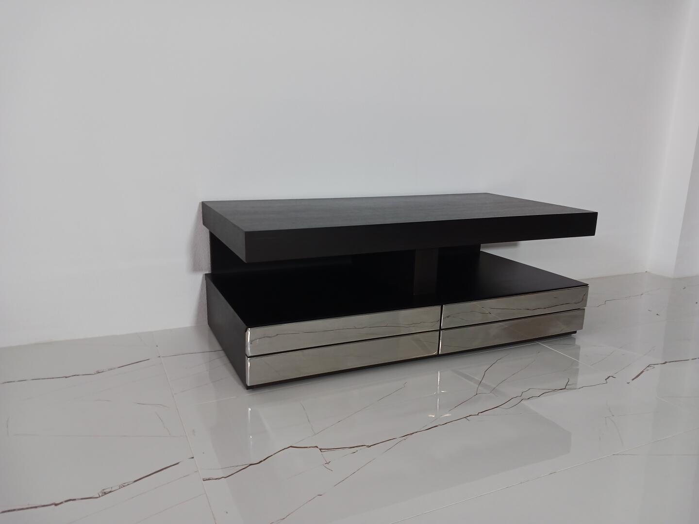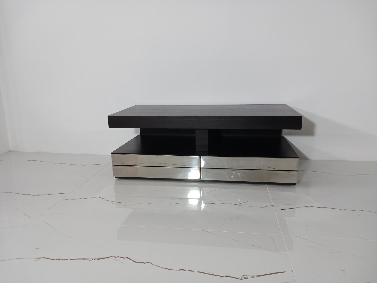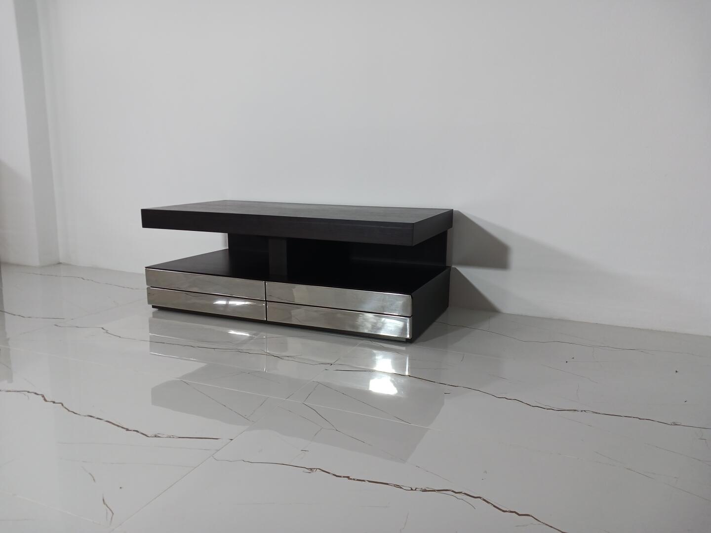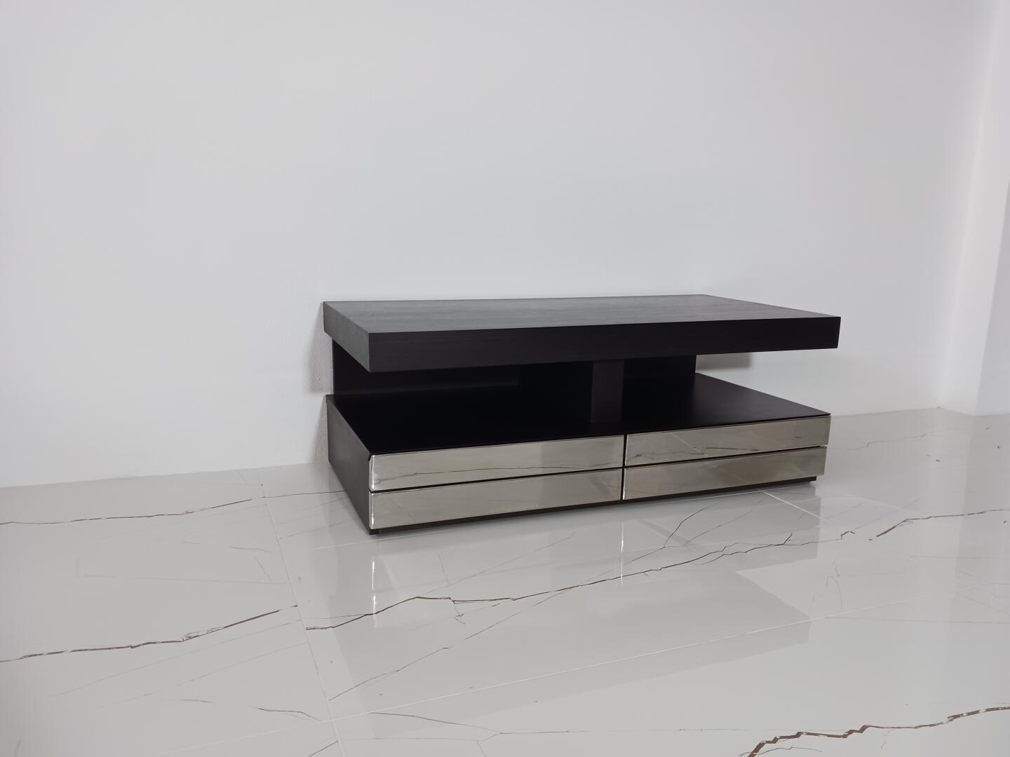 Móvel de TV em wengê com 2 gavetas, espelho de gavetas em metal prateado