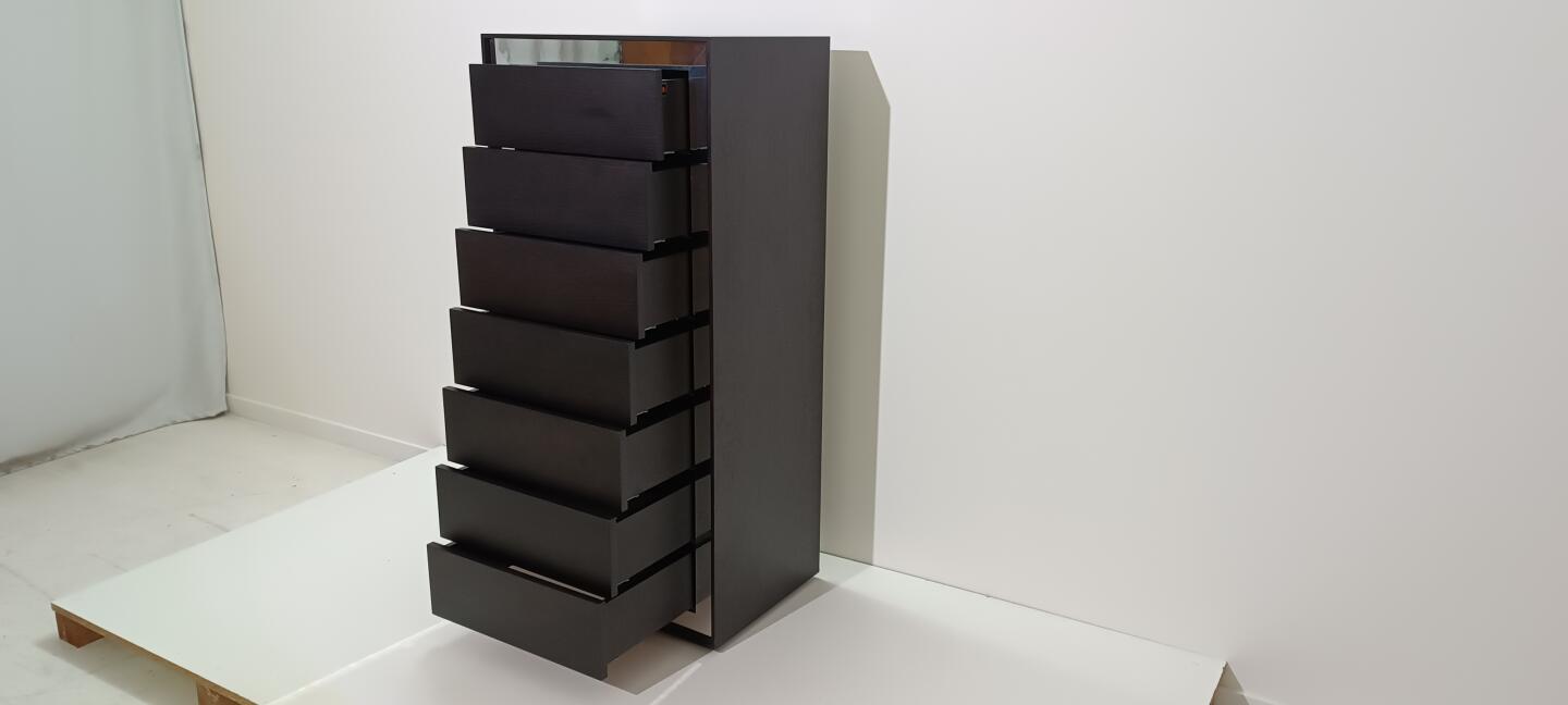 Camiseiro composto por sete gavetas todo em wengê com faixa de espelho em toda a volta de sua frente.