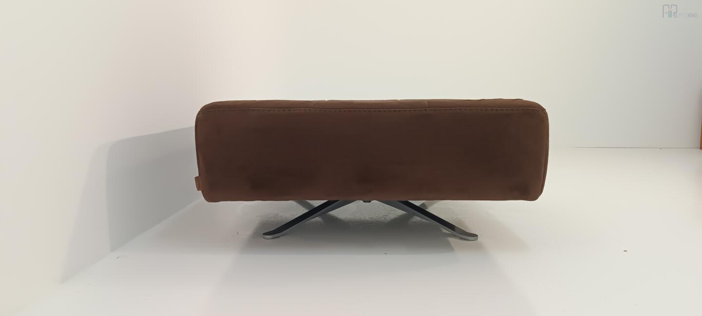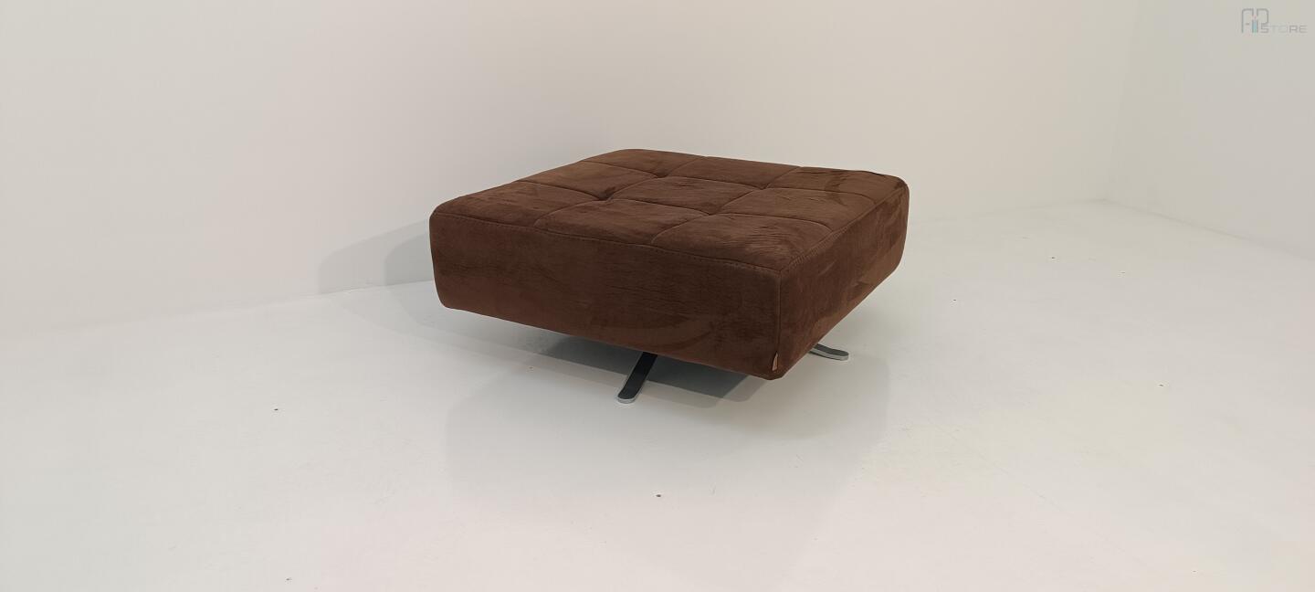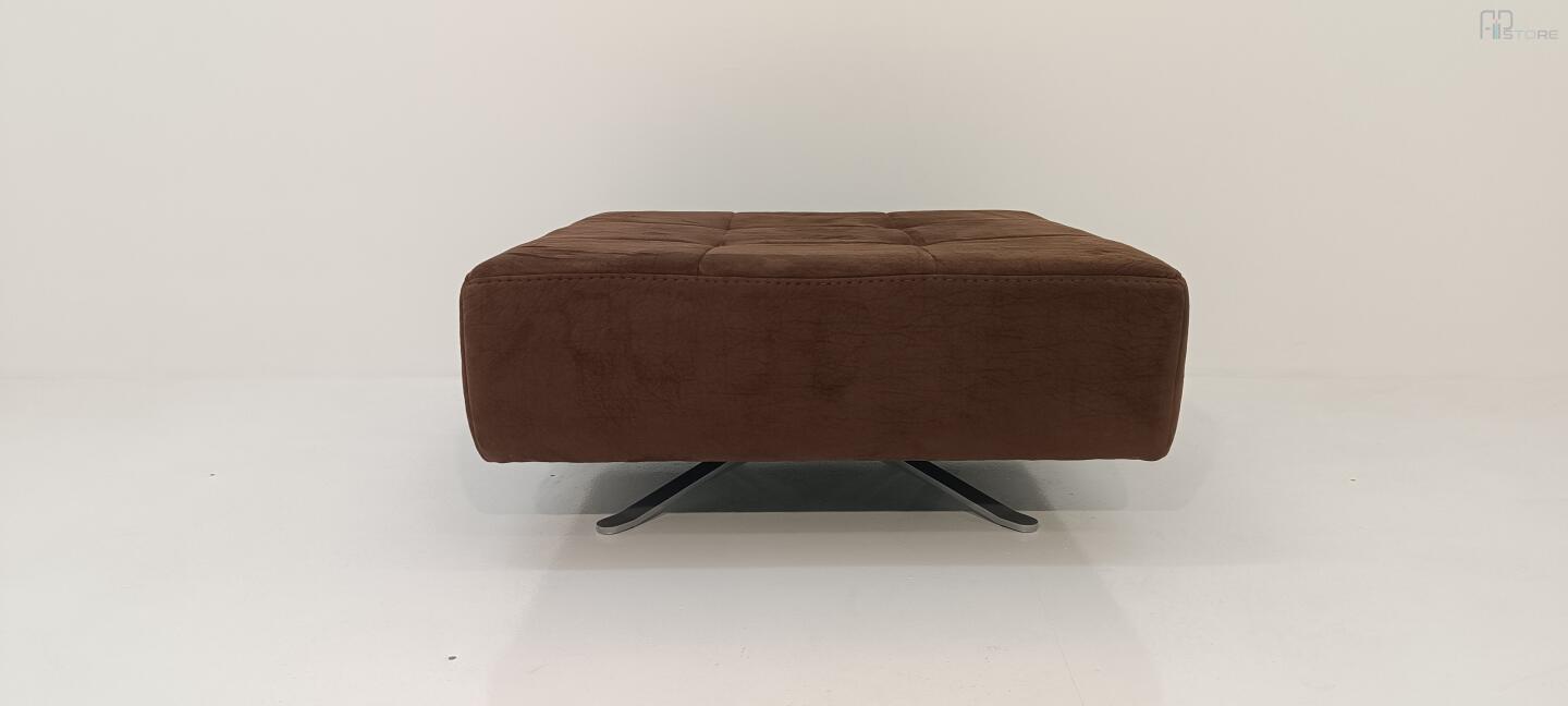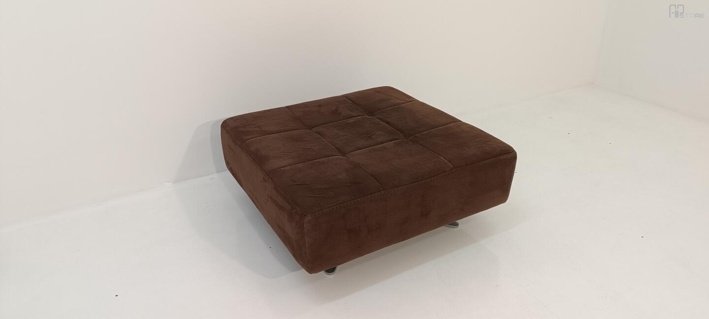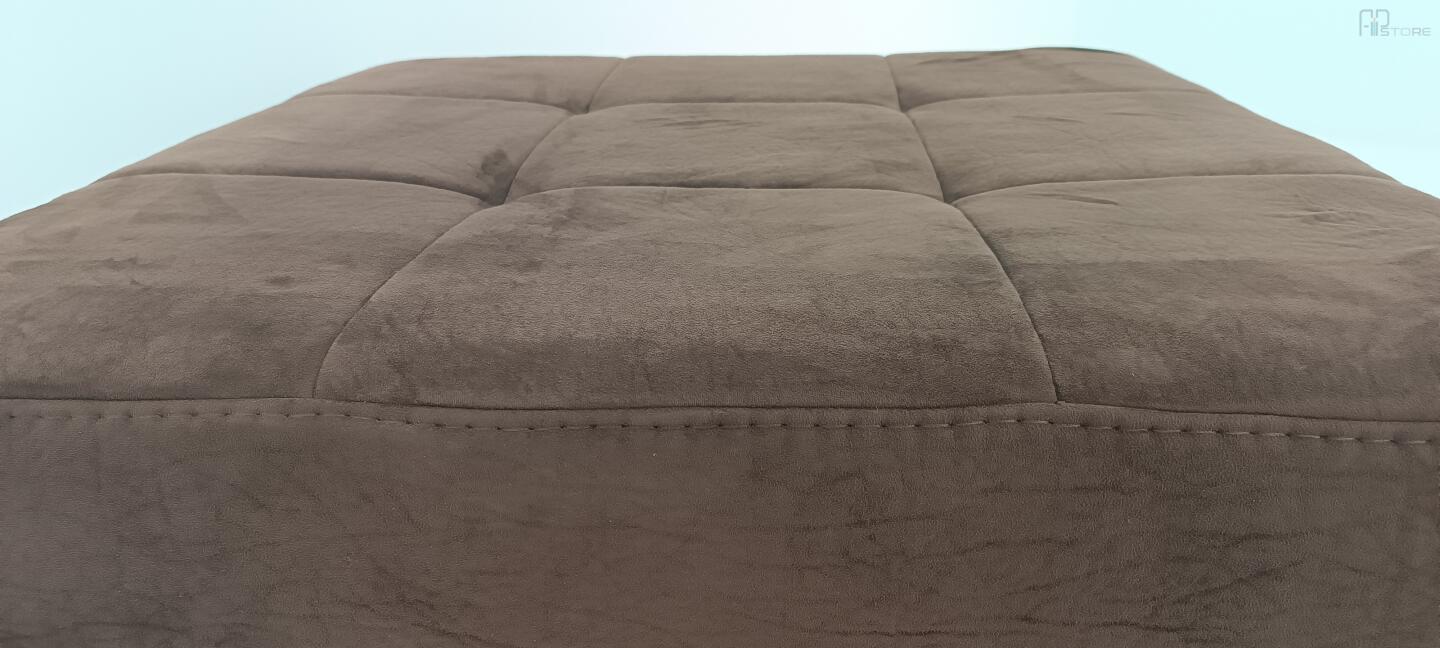 Banqueta quadrada giratória com pés em estrutura de metal cromado e com tecido castanho costurado
