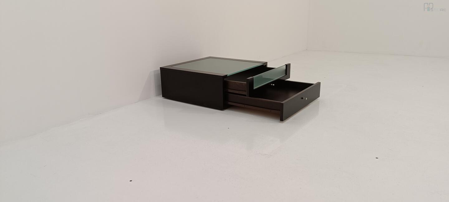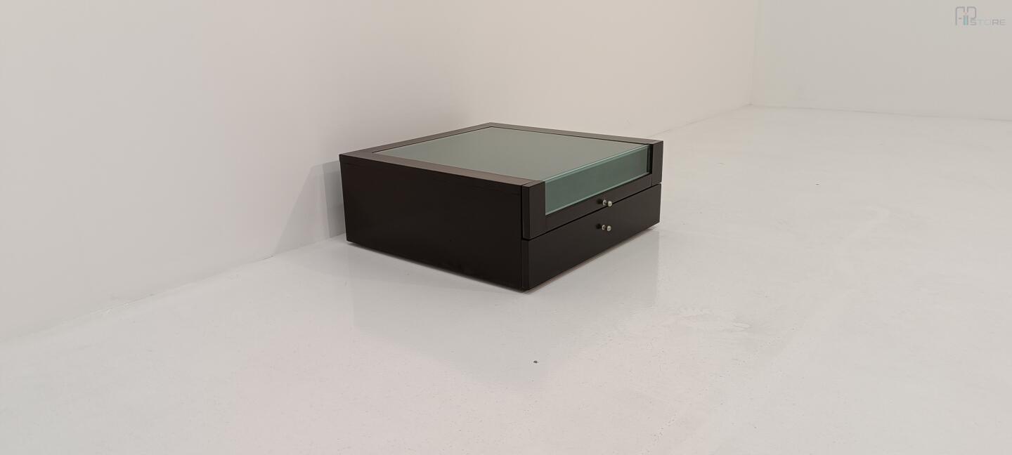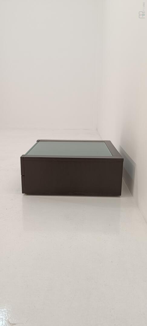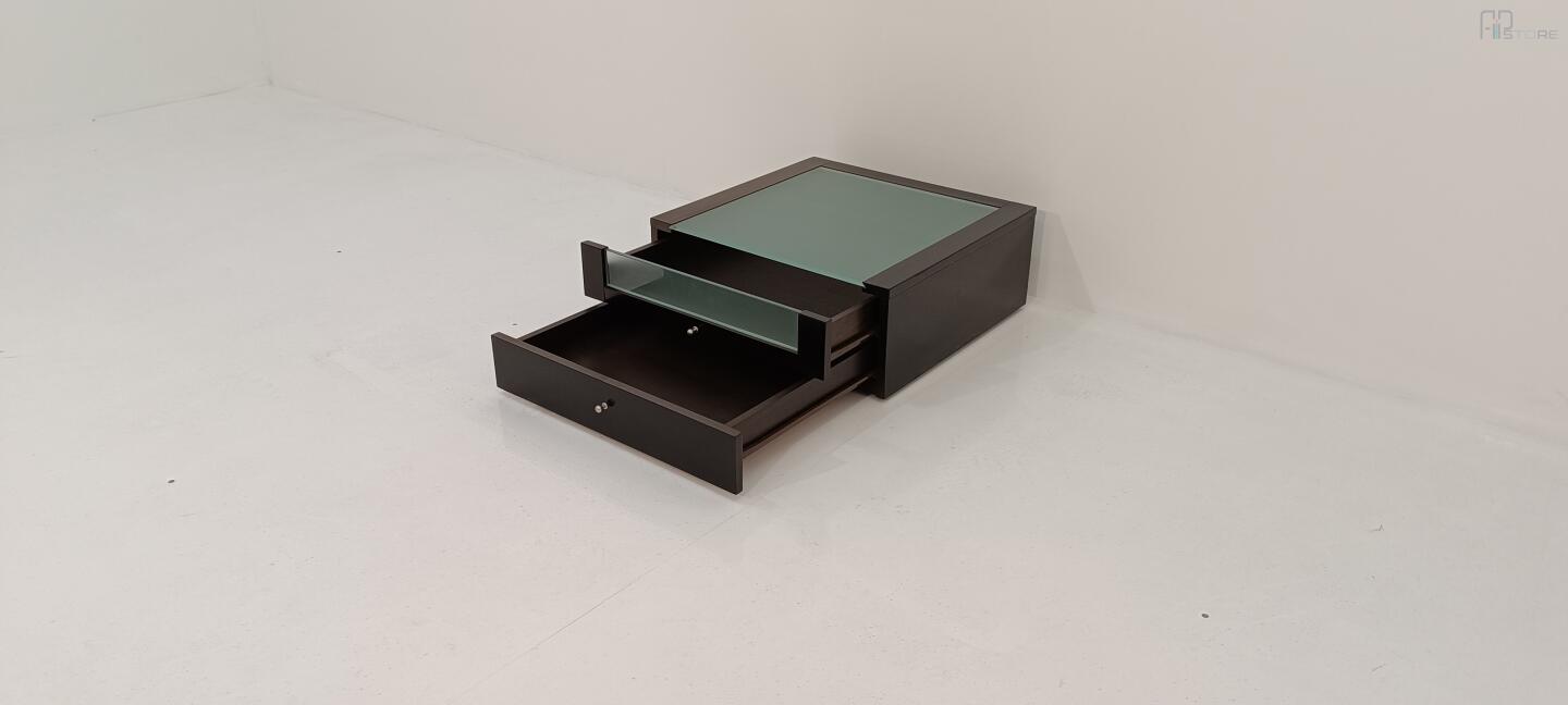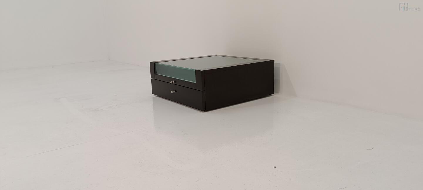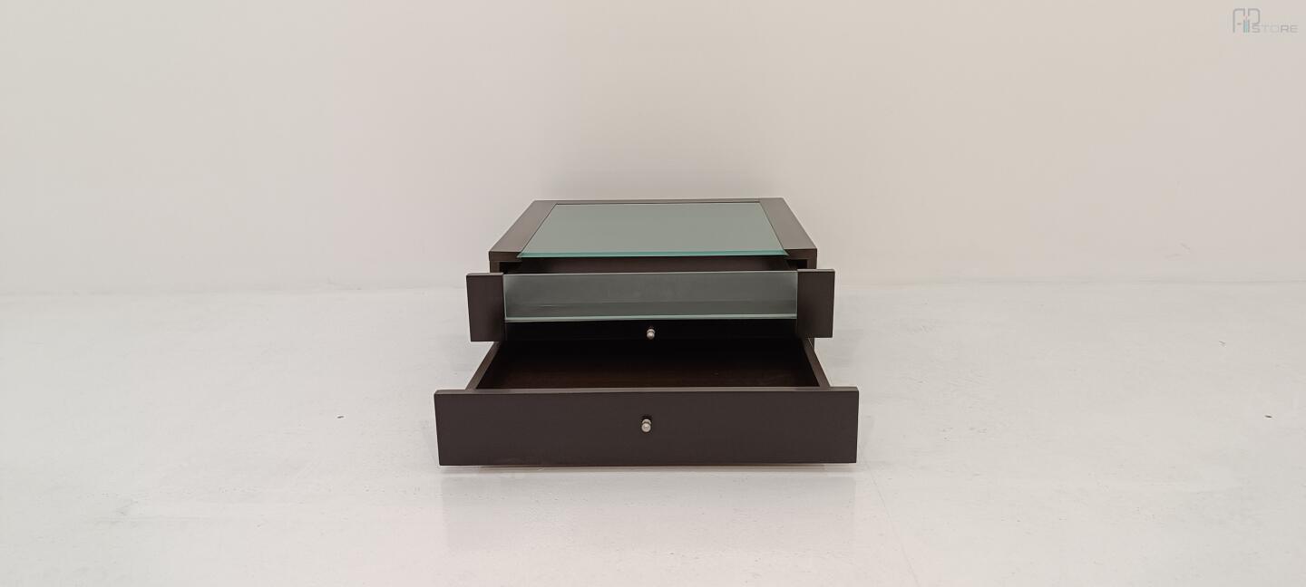 Mesa de Cabeceira em wengê escuro com Tampo em Vidro e 2 gavetas, gaveta de cima com sua frente parcialmenete em vidro