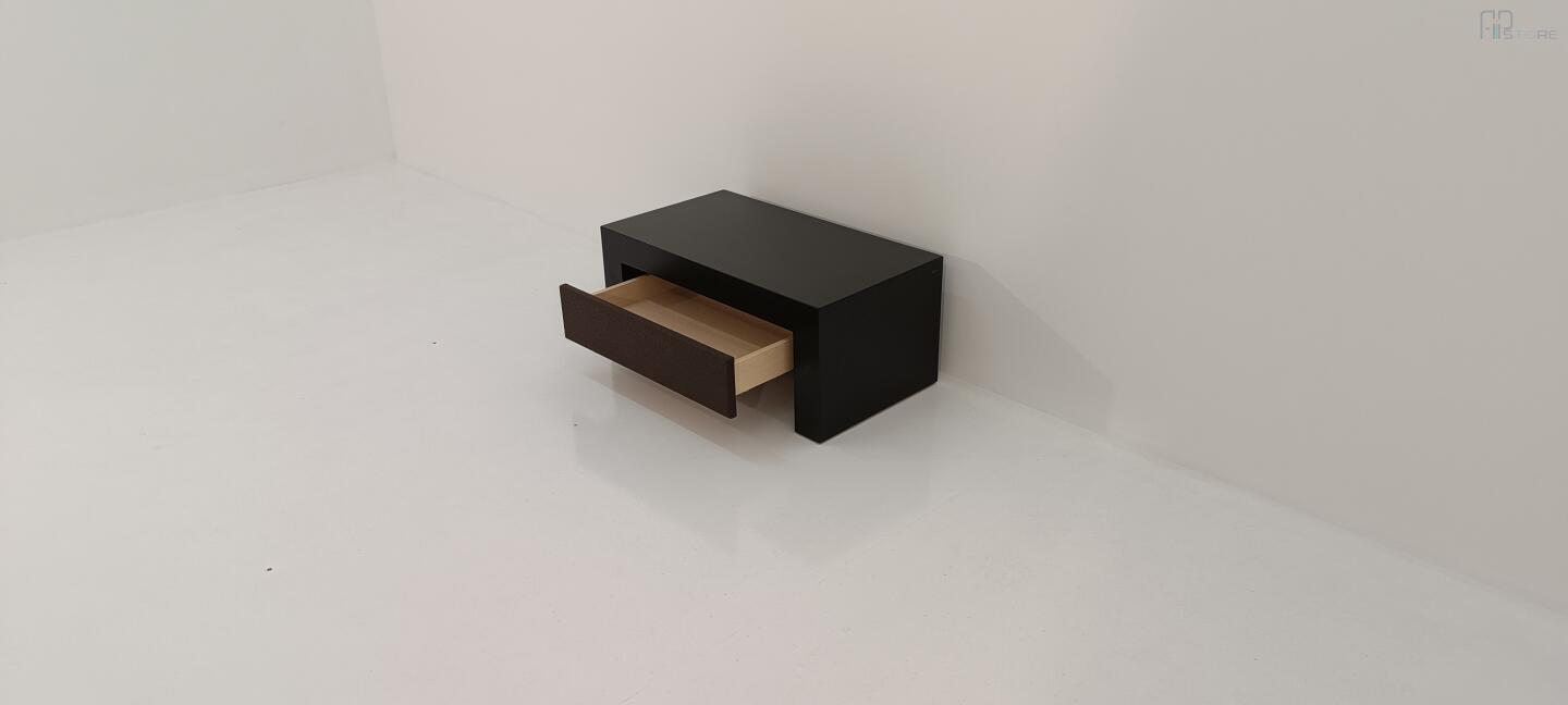 Mesa cabeceira em tom wengê escuro com uma gaveta e seu espelho forrado em pele