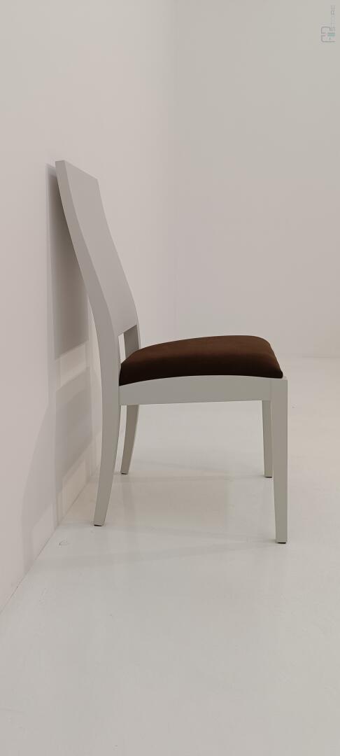 Cadeira lacada branco marfim “RAL 9002”, com assento em tecido castanho.